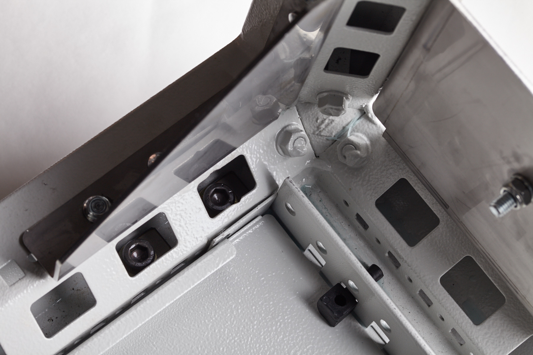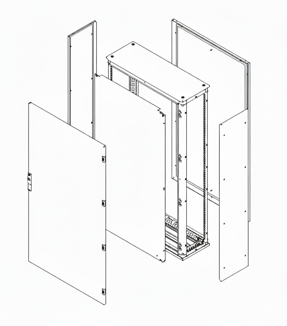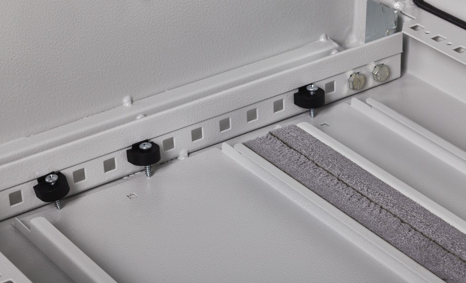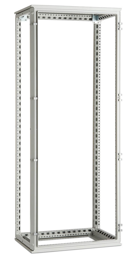 1,5 mm thick steel sheet drawn-columns bearing frame; drawn-columns are fixed and welded to die-cast aluminum joints. 25 mm pitch drilling scheme; roof and plinth fixed to structure.